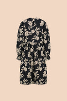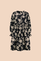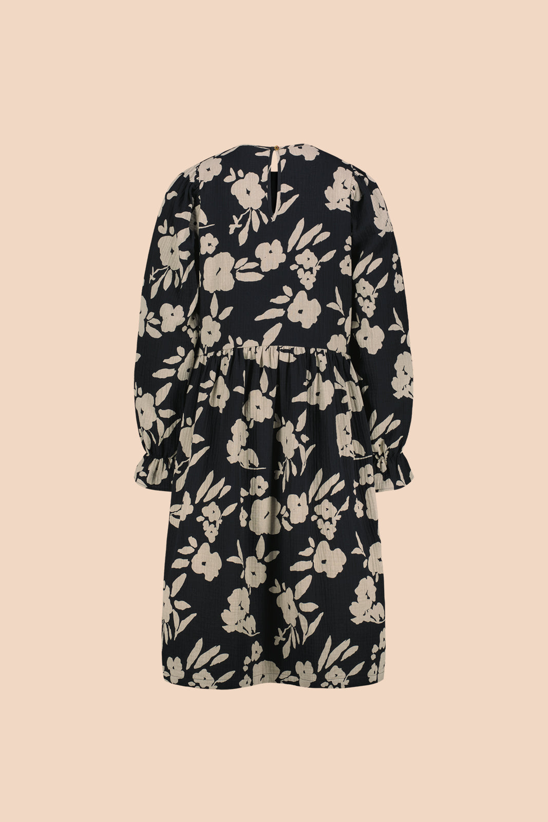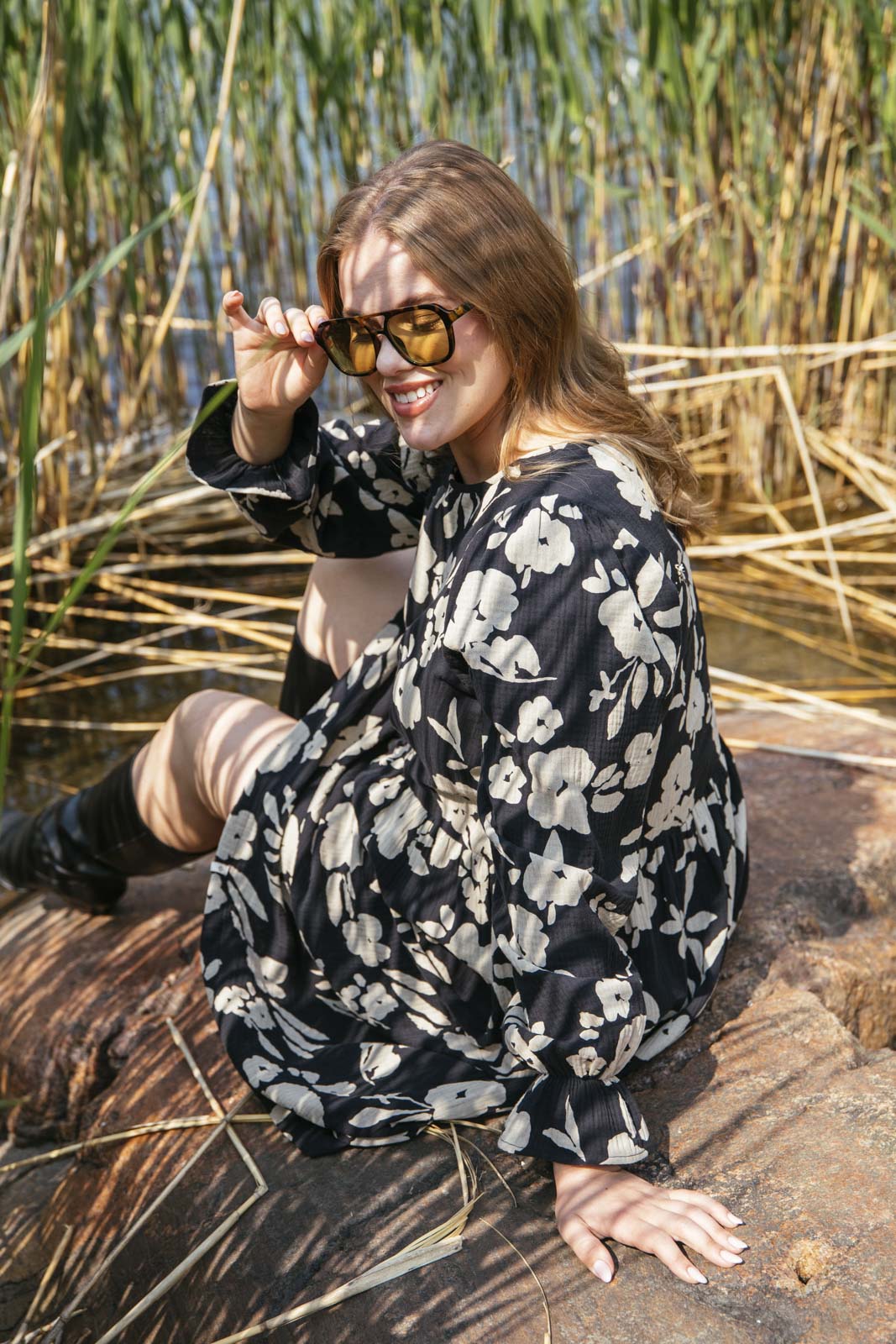This high-quality women's long-sleeved dress stands out with its beautiful details: the cuffs are gathered with an elastic band and decorated with a delicate frill. There is a small slit at the neck and a button fastening. The pattern is Windflower with a black base and large beige flowers. This timeless women's dress is perfect for both casual daytime wear and the most festive occasions - you can easily transform the style with accessories.