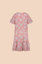 The responsibly made dress has a loose fit, a v-neckline, slightly flared sleeves and a row of buttons down the center front. The hem is decorated with a gathered frill. The frill height is 25 cm. The hem length is approximately knee-length.
