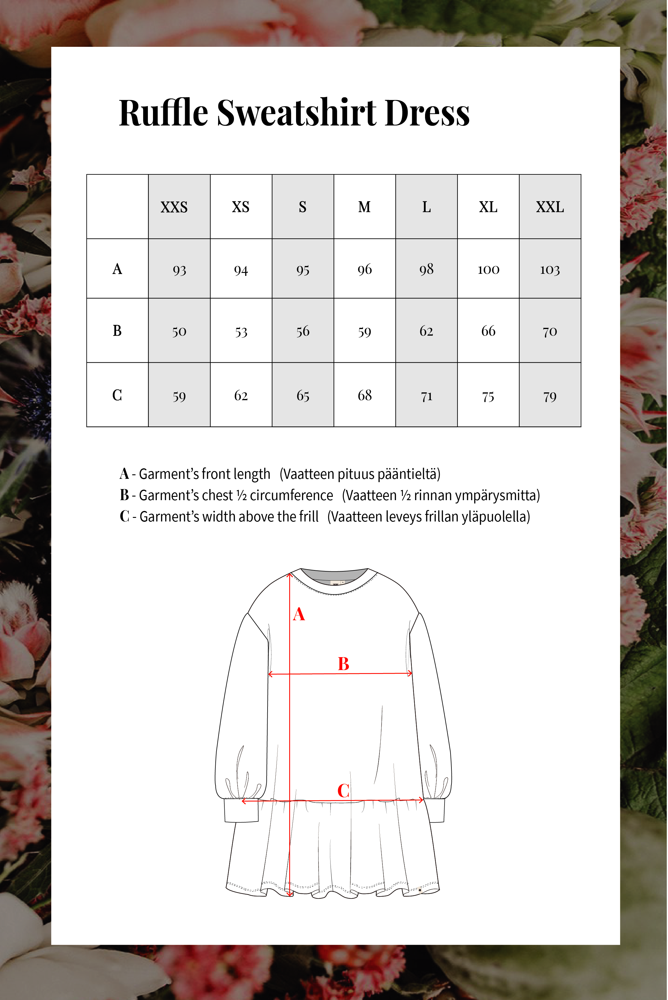 The Ruffle Sweatshirt Dress is loose and oversized. If you want a more snug fit, we recommend choosing a size smaller than you would normally choose. Use the body measurement chart and the garment measurements (last picture) to help you choose your size. The model is 163 cm tall and wears size M.