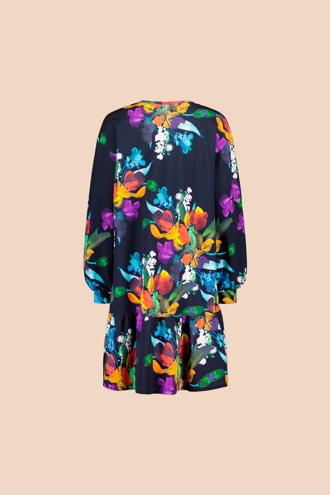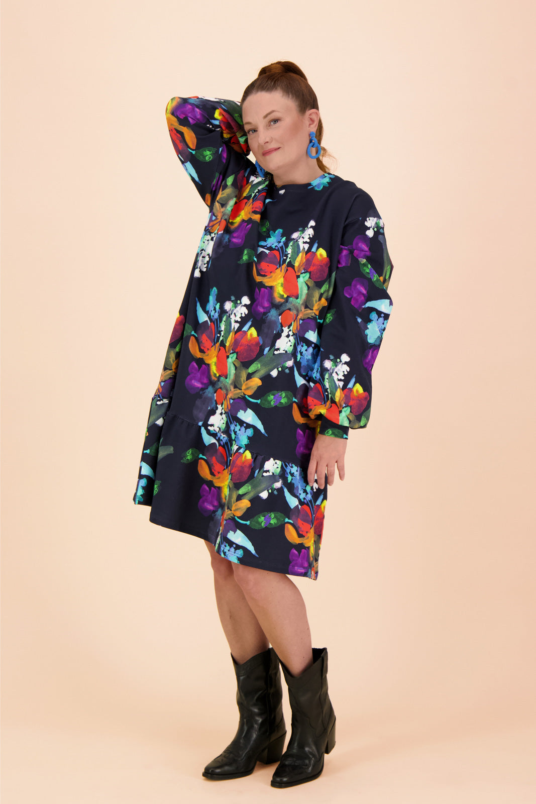 The Ruffle Sweatshirt Dress is made of wonderfully soft organic cotton stretch sweatshirt. The college dress has a loose oversize fit, short hem length, dropped shoulder line, long sleeves and a playful frill adorns the hem. The dress features Bouquet, which is full of abundant bouquets of flowers. Bright red, purple, blue and white are repeated in the colors of the flowers. The dark blue undertone emphasizes the brightness of the tones, making the patterns spectacular and delicious.