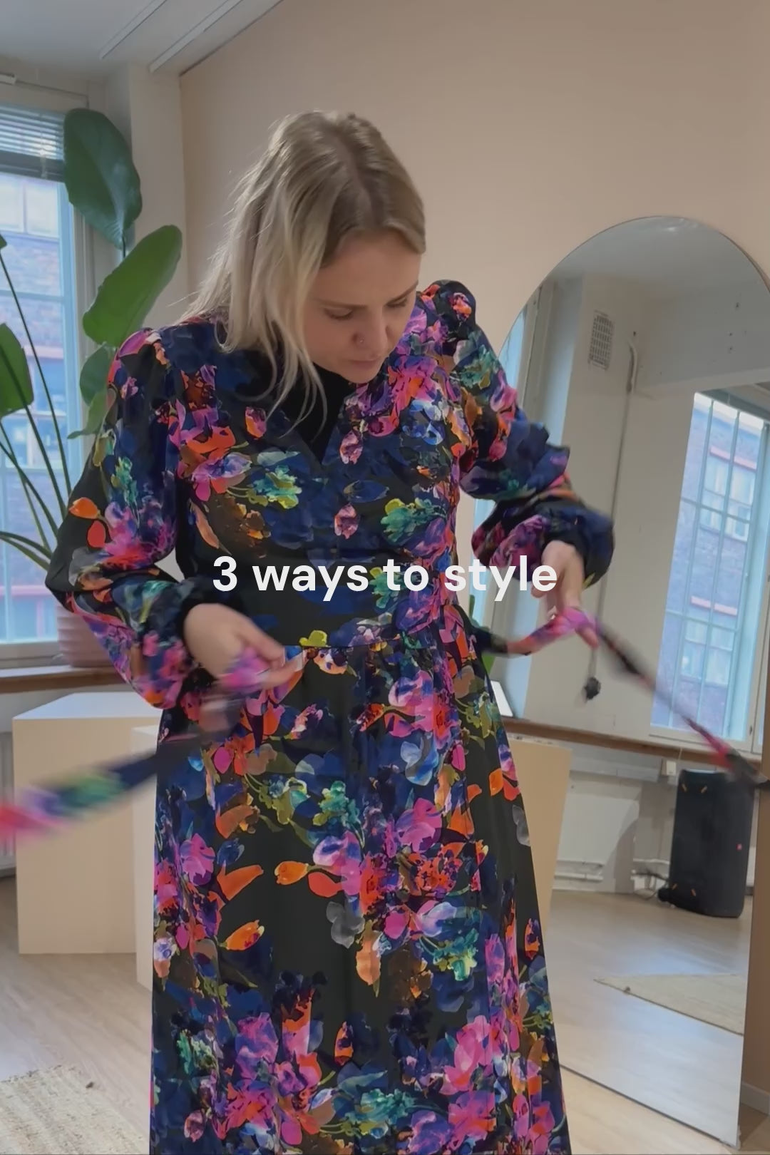 The elegant and feminine Wrap Dress is made from a beautifully draping woven crepe fabric. The dress has a flattering wrap-around cut, and a waist-accentuating ribbon fastening allows you to adjust the fit of the waist just the way you like it. The dress has loose full-length sleeves, elasticated cuffs and a pleated shoulder that adds volume to the sleeves. The hem length is calf length. The wrap dress features an intense watercolour Sweet Pea pattern, with charming scented peas blooming in layers on a dark green background, accentuating the enchanting array of flowers.