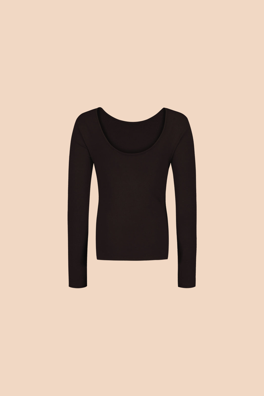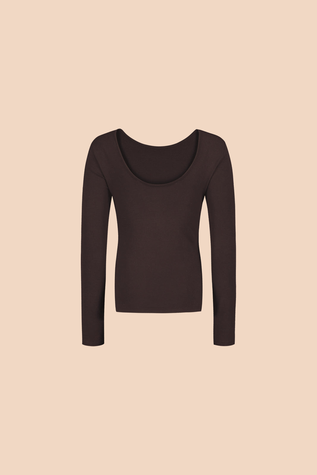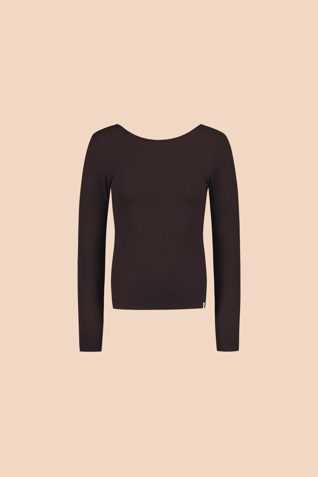 The Scoop Back Top is a long-sleeved, fitted women's shirt with a scoop neckline on the back. The shirt can also be worn the other way around, where the scoop neckline highlights your cleavage. The classic shirt comes in a delicious brown color.