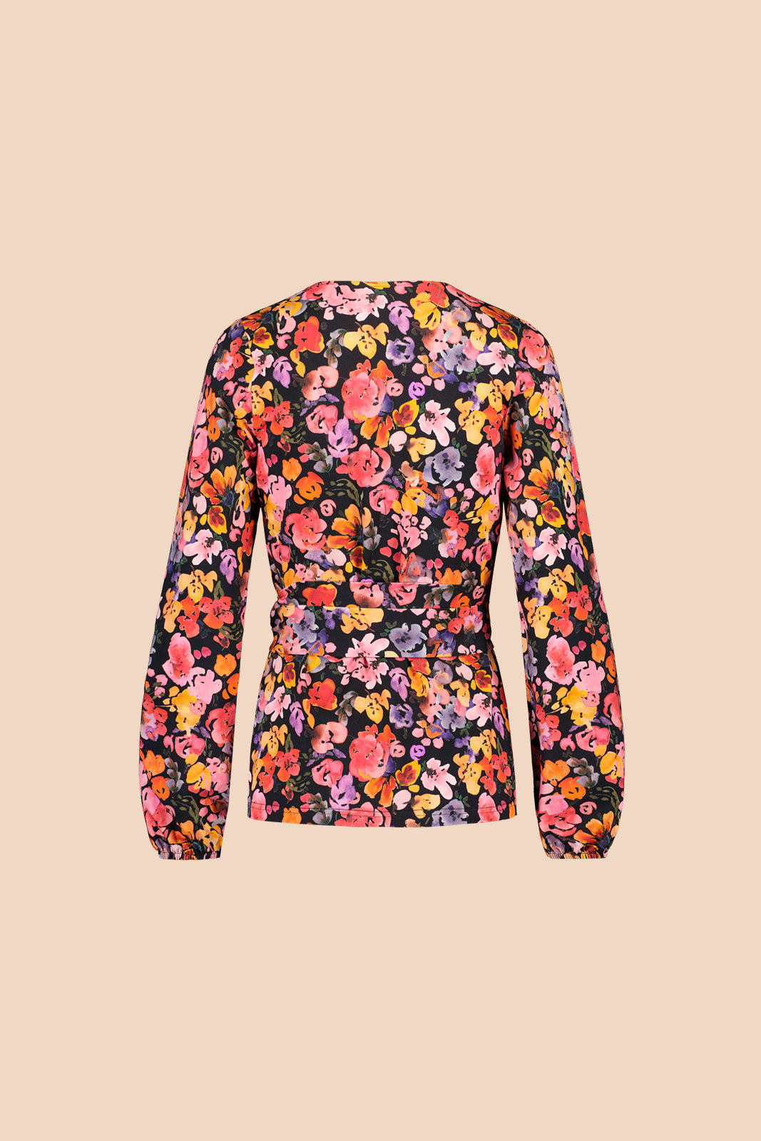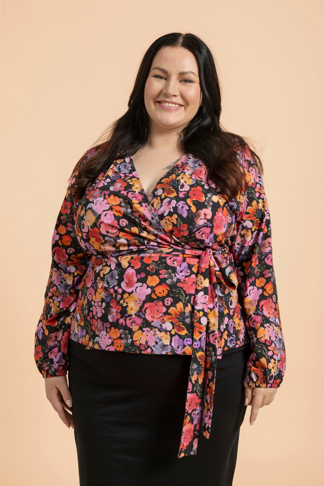 The striking Wild Lea floral pattern features a black base with a colorful sea of watercolor flowers. The high-quality Soft Wrap Blouse is designed and manufactured to last for years of use.