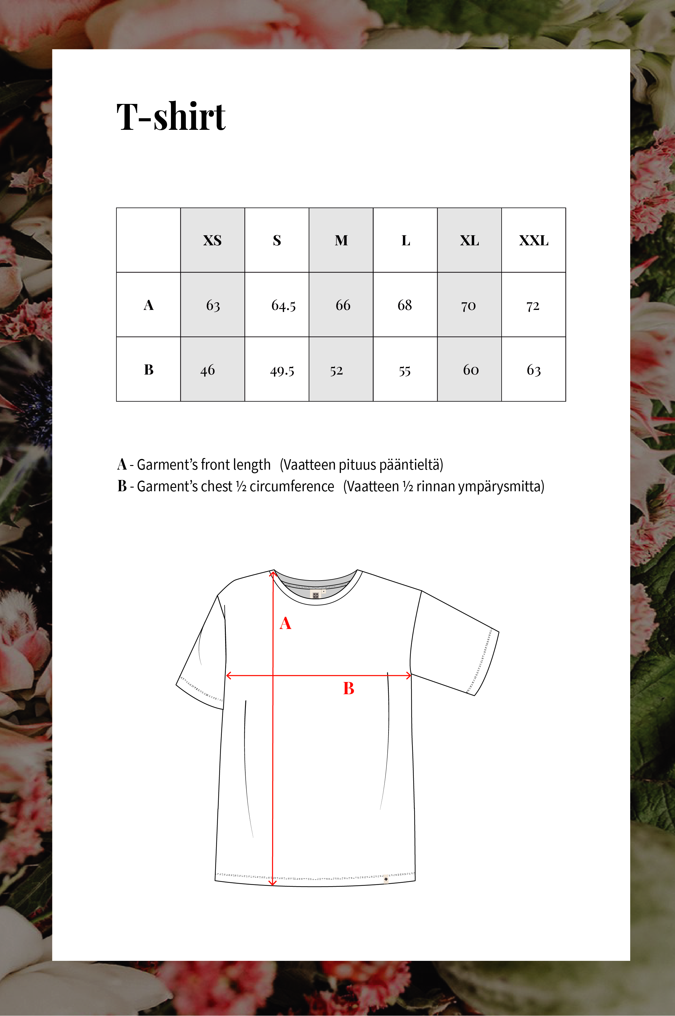 A versatile and high-quality women's tricot t-shirt that is easy to combine with your favorite jeans and skirts. At the request of our customers, the hem of the shirt has been slightly lengthened from previous collections (you can check the planned length in the measurement table, which can be found in the pictures). T-shirt pattern Cobalt Rose, which is a treatise on a garden painted by moonlight. In the patterns, the watercolor flowers are sprawling on a dark blue background.