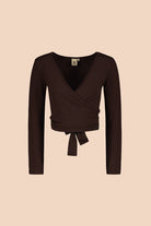 The shirt has full sleeves, a slightly shorter hem and a feminine wrap cut. The fit can be adjusted to your liking with the ties at the waist. The wrap shirt is in a dark brown color.