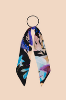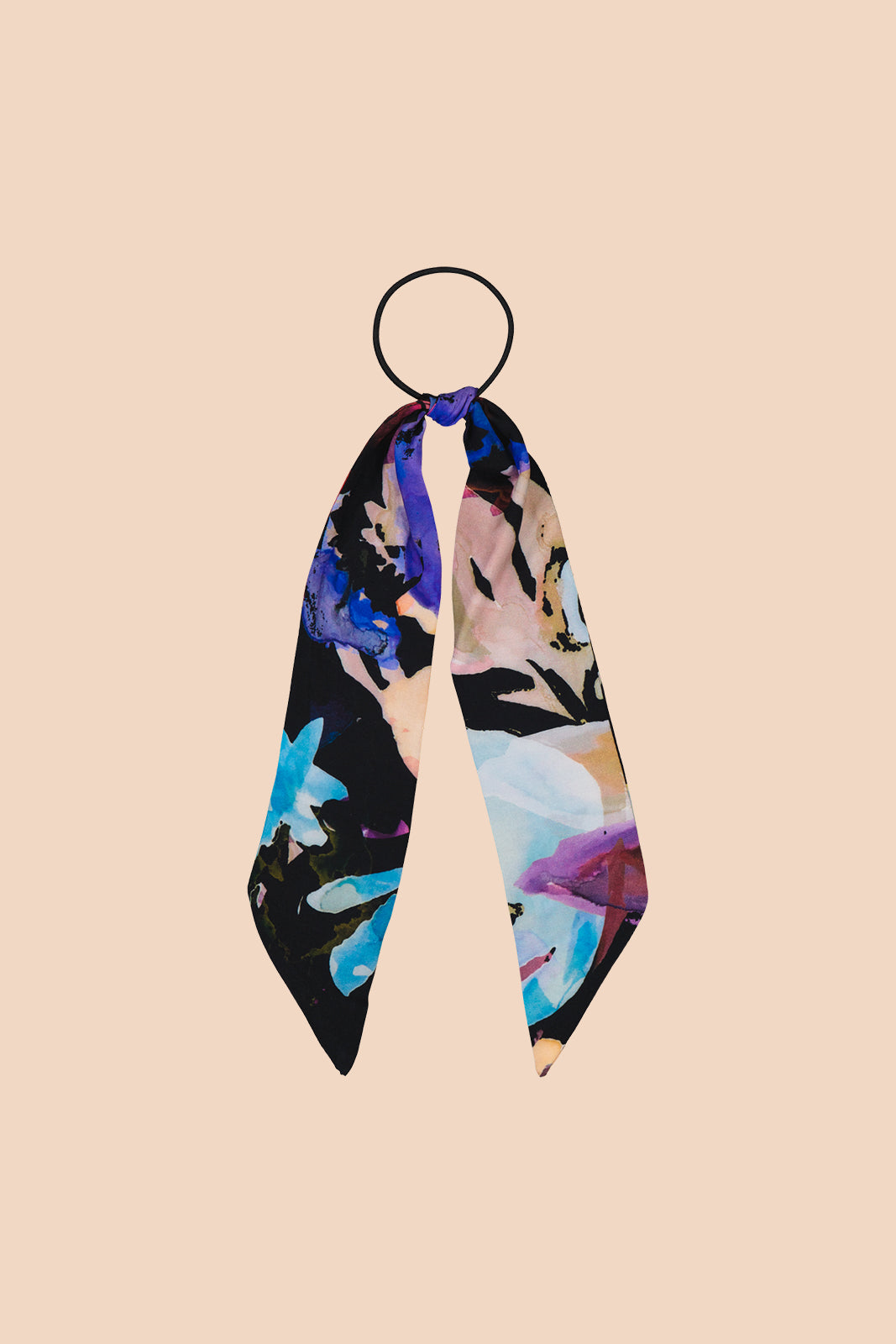 The Ponytail Scarf is in the Black Anemone pattern. A mini scarf is tied to a black rubber hair loop, which can be removed for other hair styling purposes if desired.