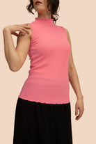 The premium women's top has a fitted cut and features an elegant turtle neckline. The neckline and hem are finished with stylish rolled hems. The color is a striking pink.