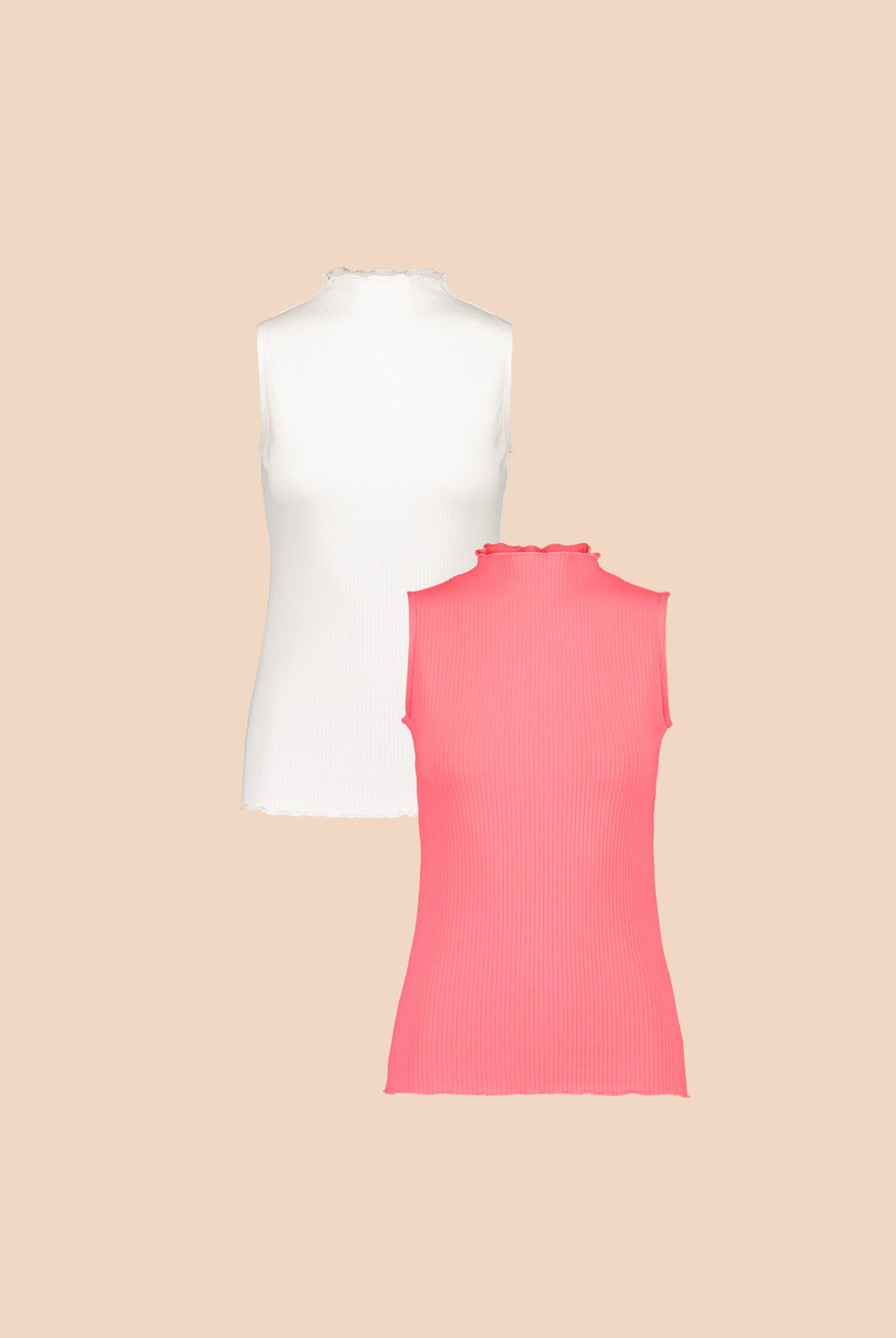 Rib top is a close-fitting sleeveless ribbed knit top with an elegant turtleneck. The neckline and hem are finished with a rolled hem, which creates a beautiful detail to the classic top. The rib knit is a smooth and well-falling material with a luxurious feel. The ribbed top works both on its own and when worn, for example, under a cardigan, kimono or dress. The color is pure white.