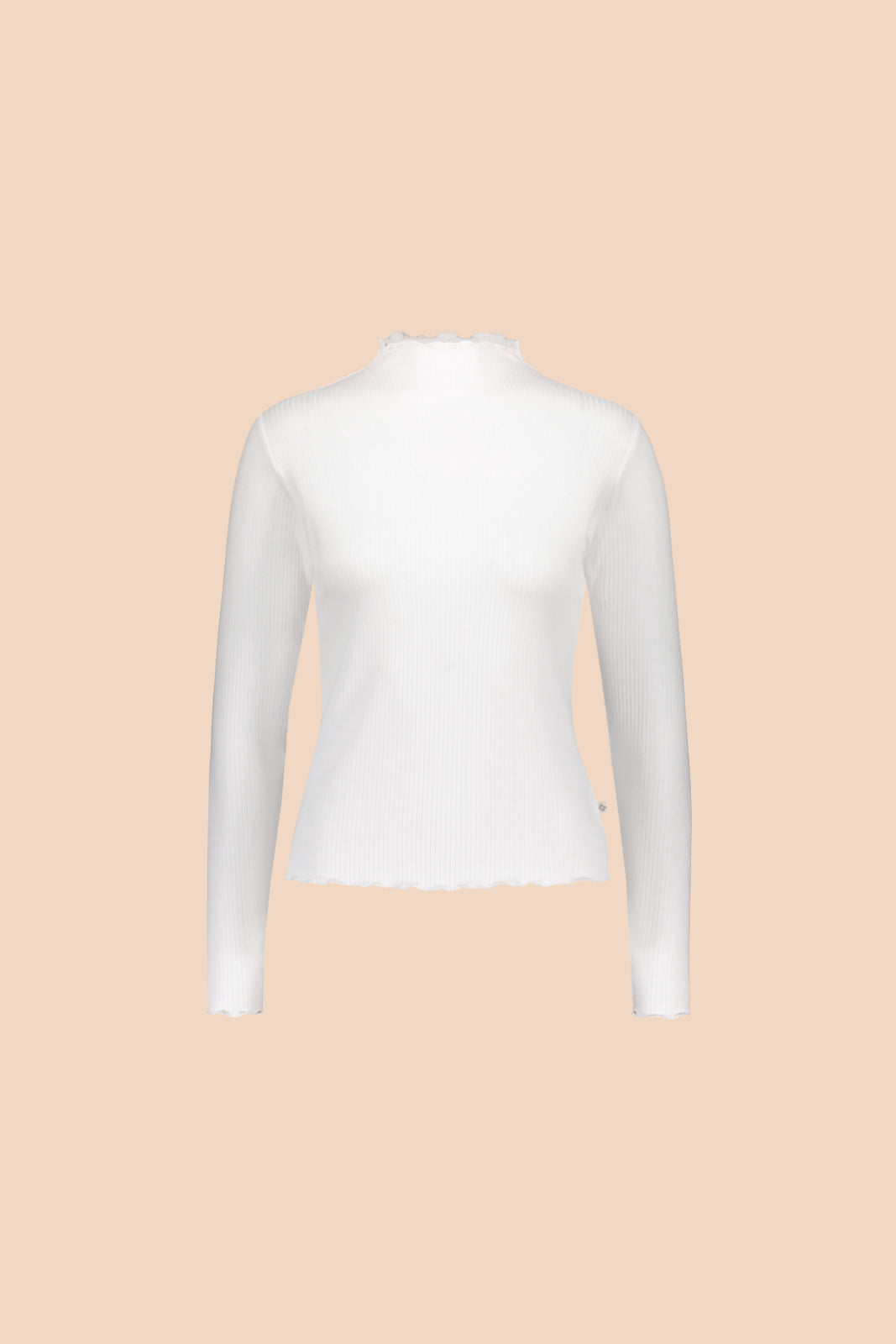 This high-quality women's shirt has a fitted cut and an elegant turtleneck. The neckline, hem and cuffs are finished with rolled hems. The color is off-white.