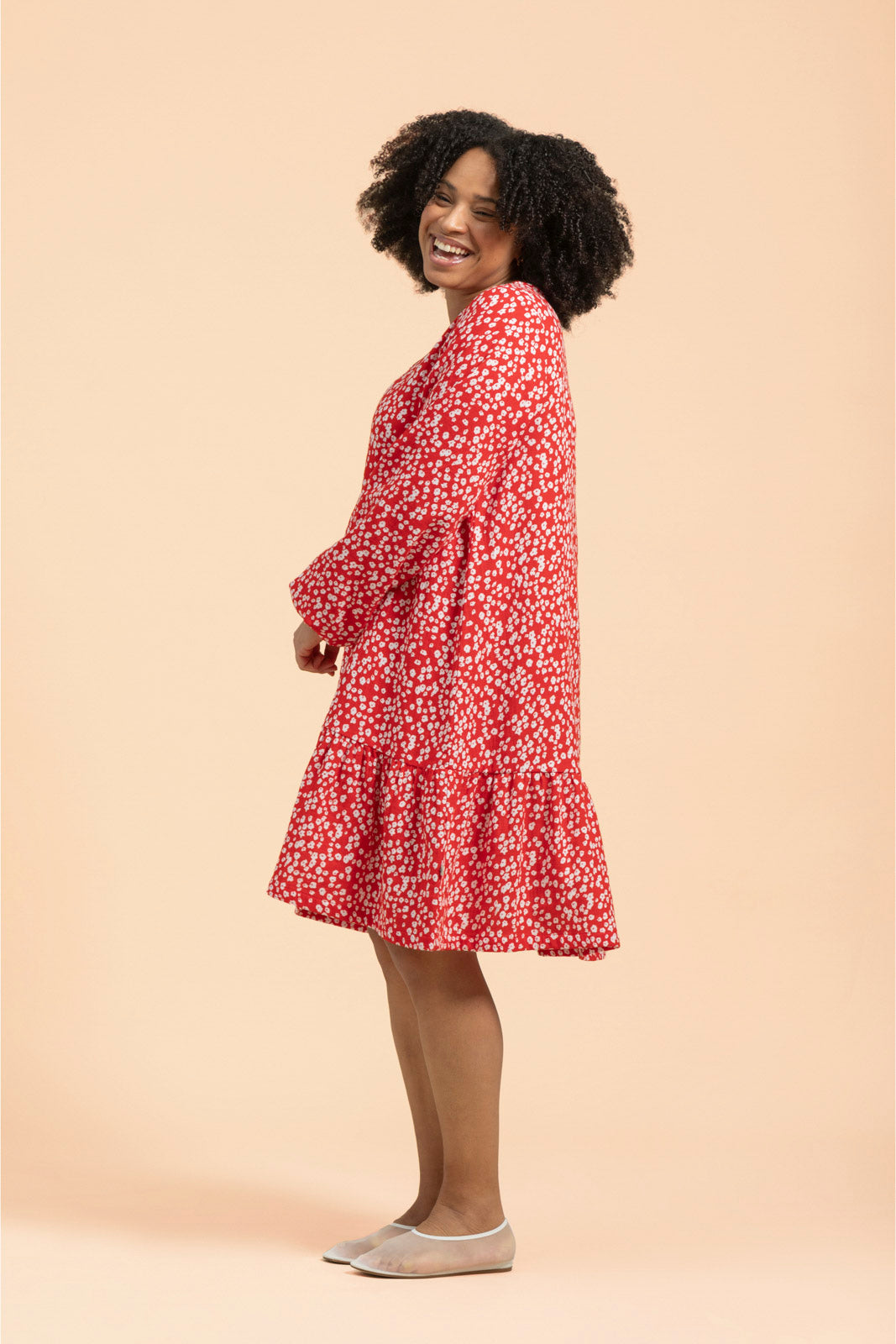 The responsibly made dress has a loose fit, a V-neckline and relaxed full-length sleeves. The cuffs are gathered with an elastic band, which makes it easy to pull the sleeves of the dress to elbow length if desired. The center front of the dress is decorated with an open button row, and the hem is decorated with a gathered frill. The frill height is 25 cm, and the length of the hem is approximately knee-length. The pattern is the timeless Flora Red, with small white flowers sprawling on a red background.