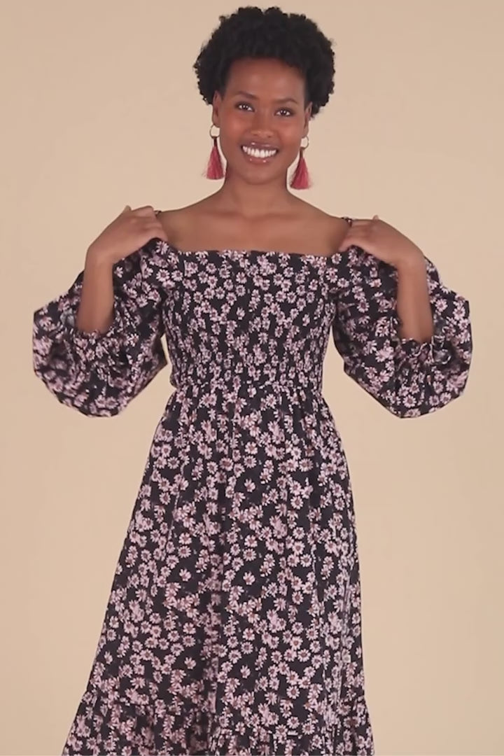 The large puff sleeves are designed for versatility: elastic bands on the shoulders keep the sleeves firmly in place, and if you want, you can create an off-shoulder style by pulling the sleeves down from the shoulders. The short-length cuffs have beautifully gathered frill details, and the midi-length flared hem is decorated with a charming frill. The pattern is the timeless Daisy, with daisies sprawling on a black background.