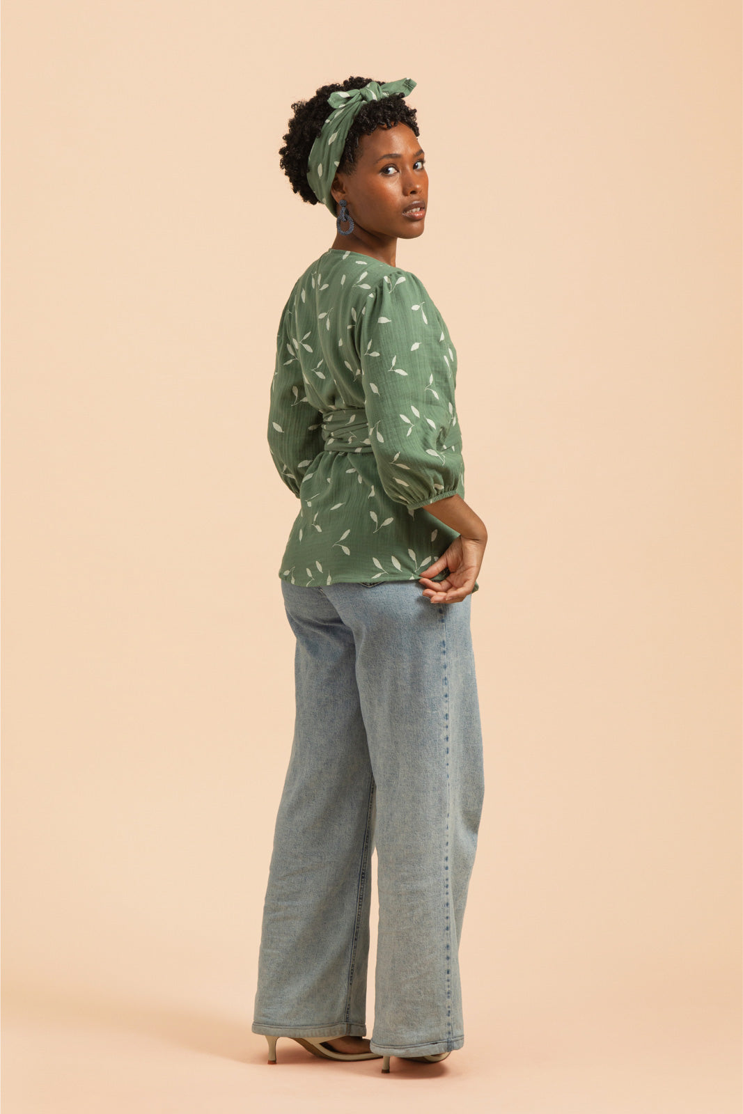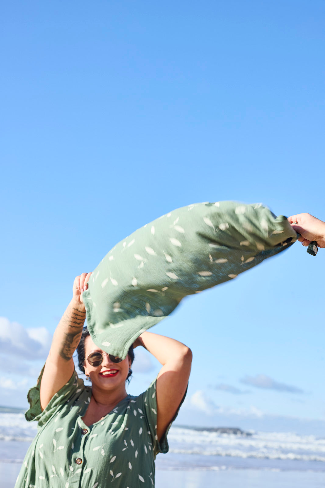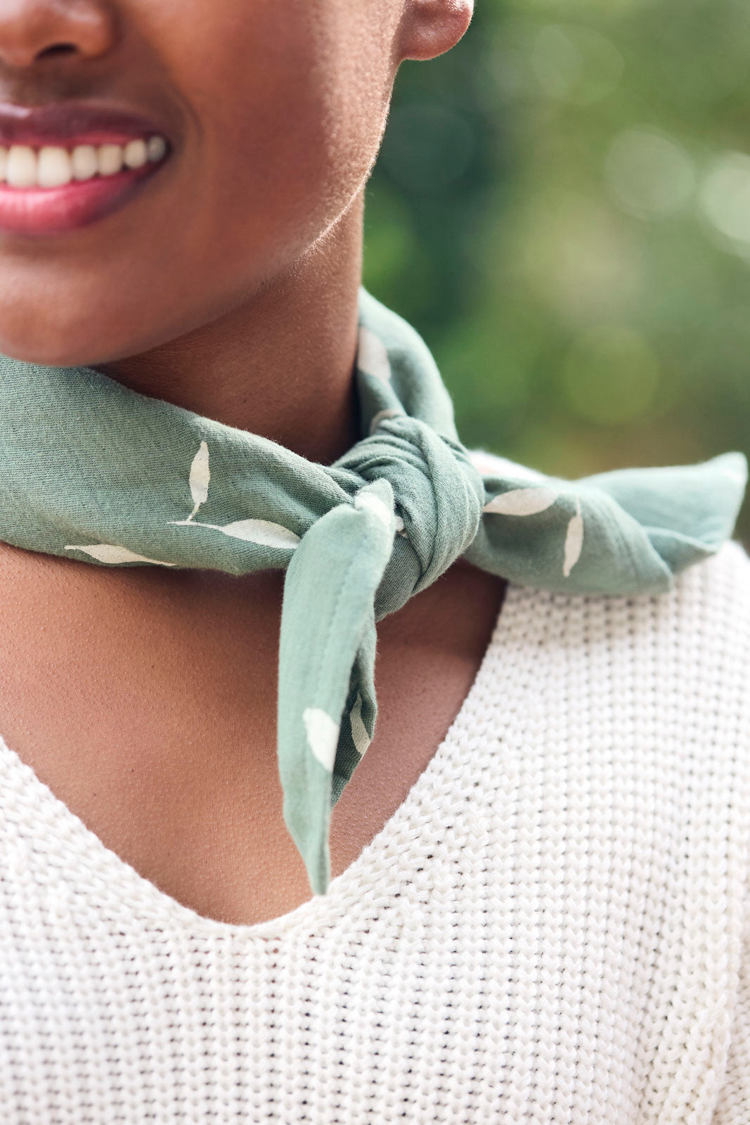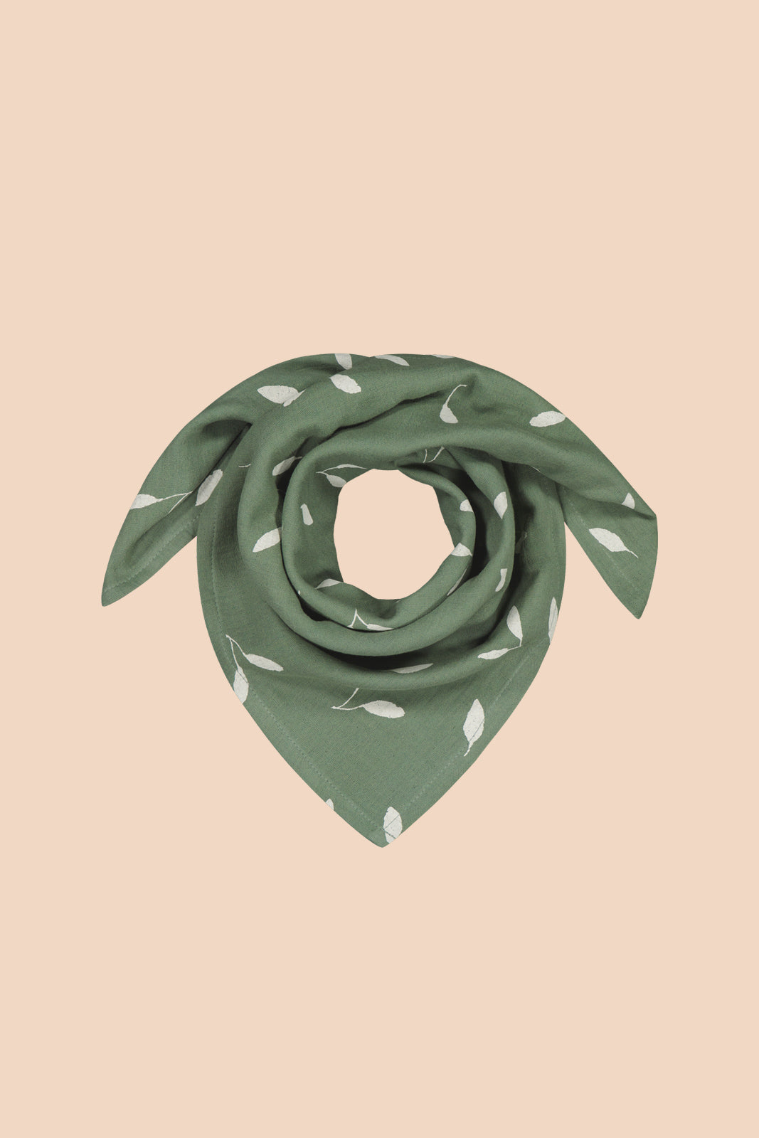 The Square Scarf is made of wonderfully light organic cotton muslin. The versatile scarf can be wrapped around your hair, neck, head or even as a decoration for your bag. The edges of the scarf are finished with a narrow hem. The scarf features a minimalist and serene Wind pattern, with off-white petals floating on a green background.