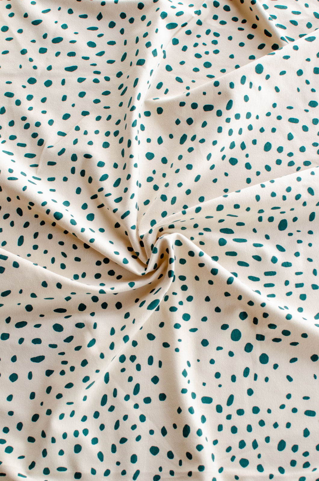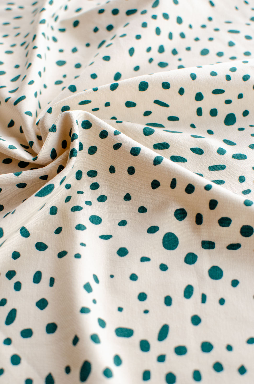 The classic Wild Dots pattern, where green dots wave on a natural light background. The knitwear is delivered as a pre-cut 2m piece. Organic cotton jersey is a very versatile, flexible and thin knit, from which you can make or customize jersey shirts, dresses and leggings - for adults or children!